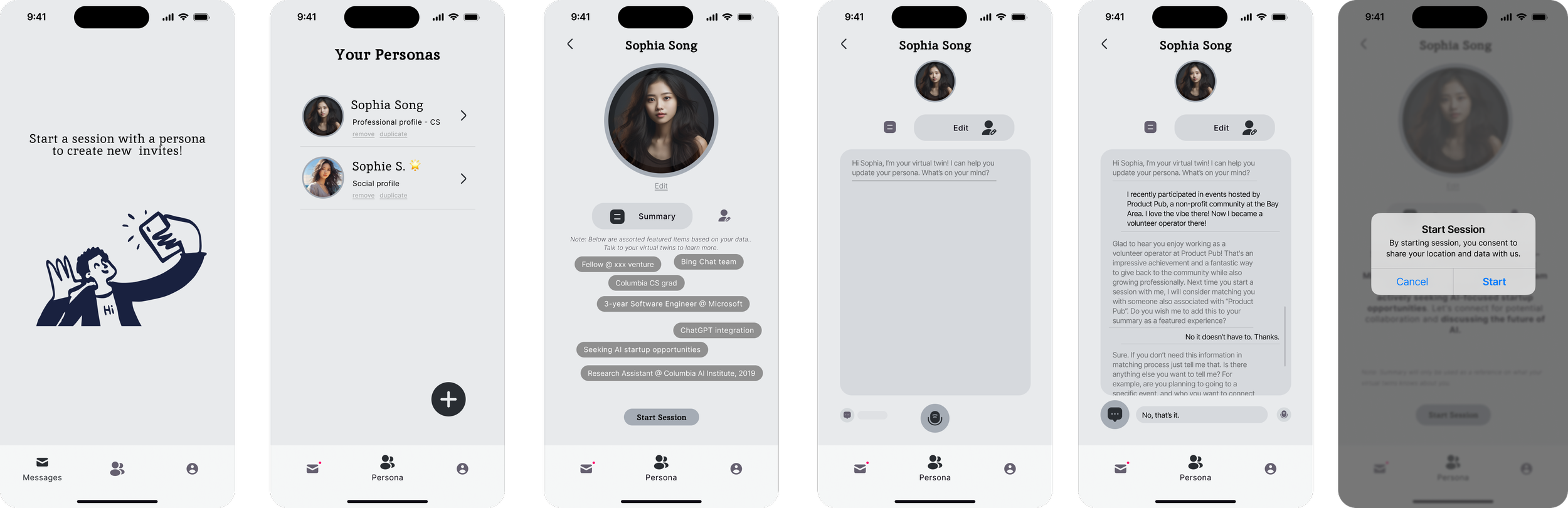 When Sophia arrives at a conference, she starts a session to make her profile visible.